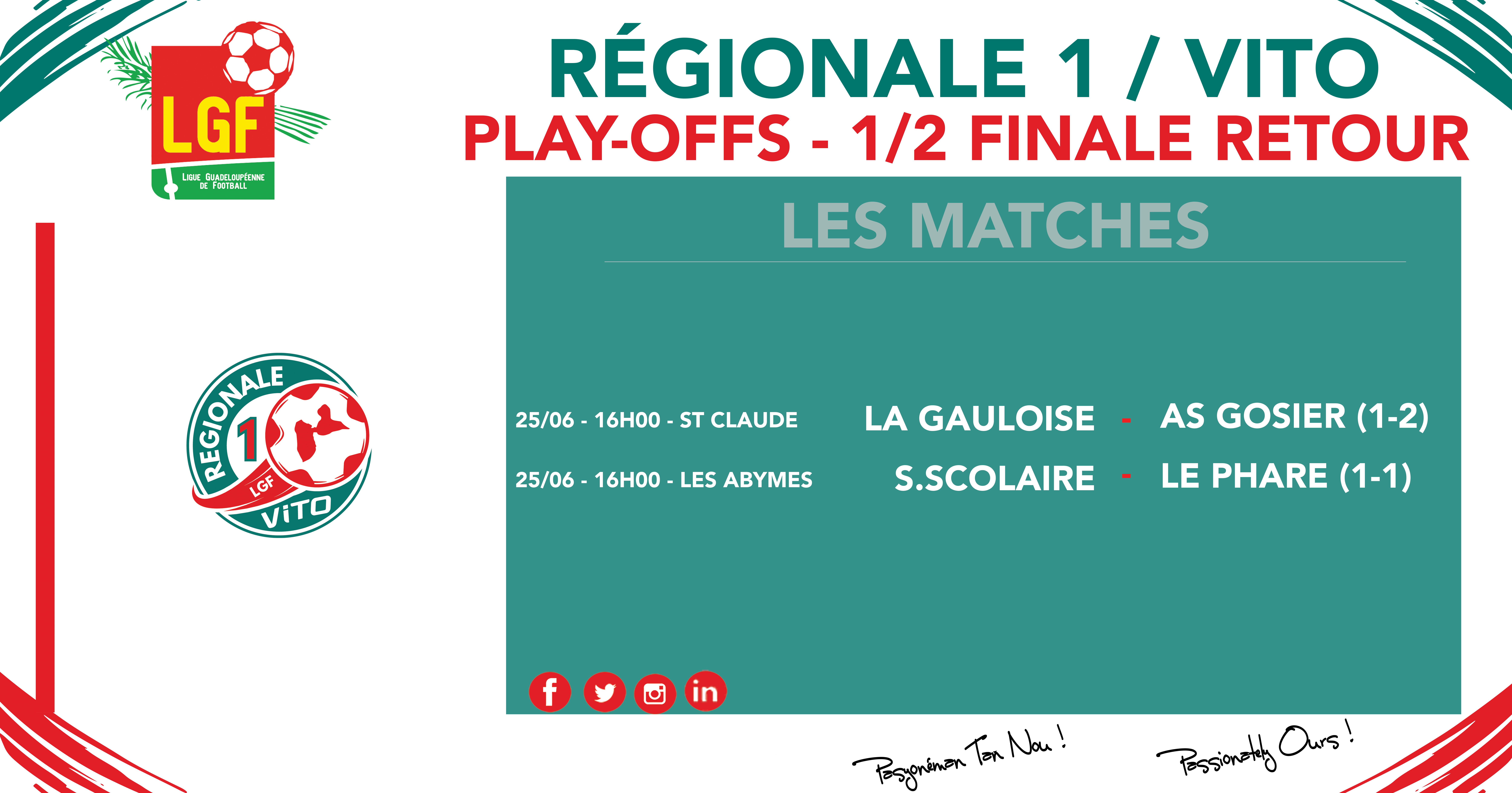 PLAY-OFFS : L’AS Gosier a pris une petite option avant le match retour en dominant samedi après-midi à Sainte-Anne La Gauloise (2-1). Dans l’autre match, Le Phare, qui menait 1-0 grâce à Livyo Damas-Agis en 1ere mi-temps, a vu la Solidarité Scolaire revenir au score par Thomas Gaydu (1-1). Tout reste ouvert avant les matches retour le 25 juin !